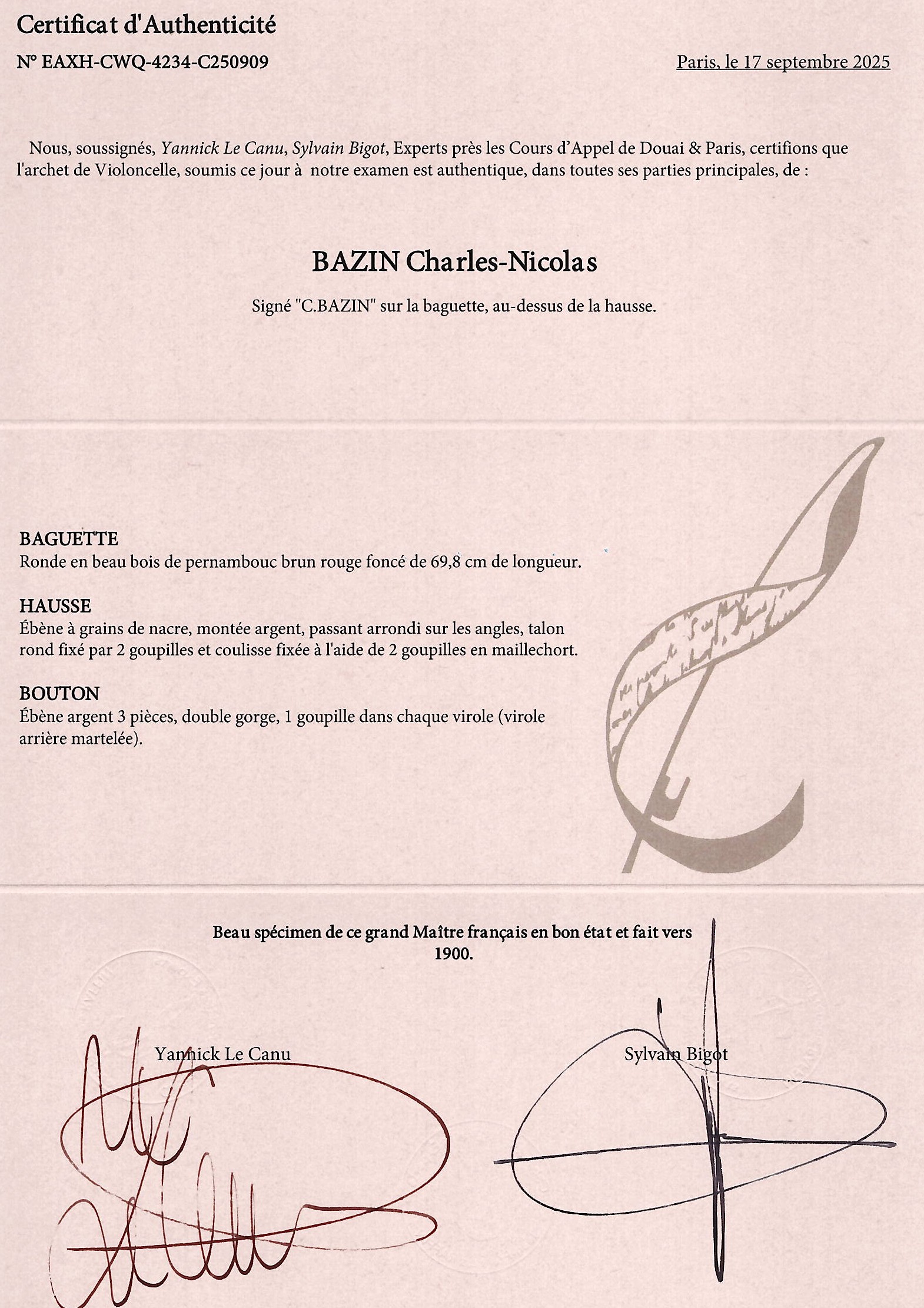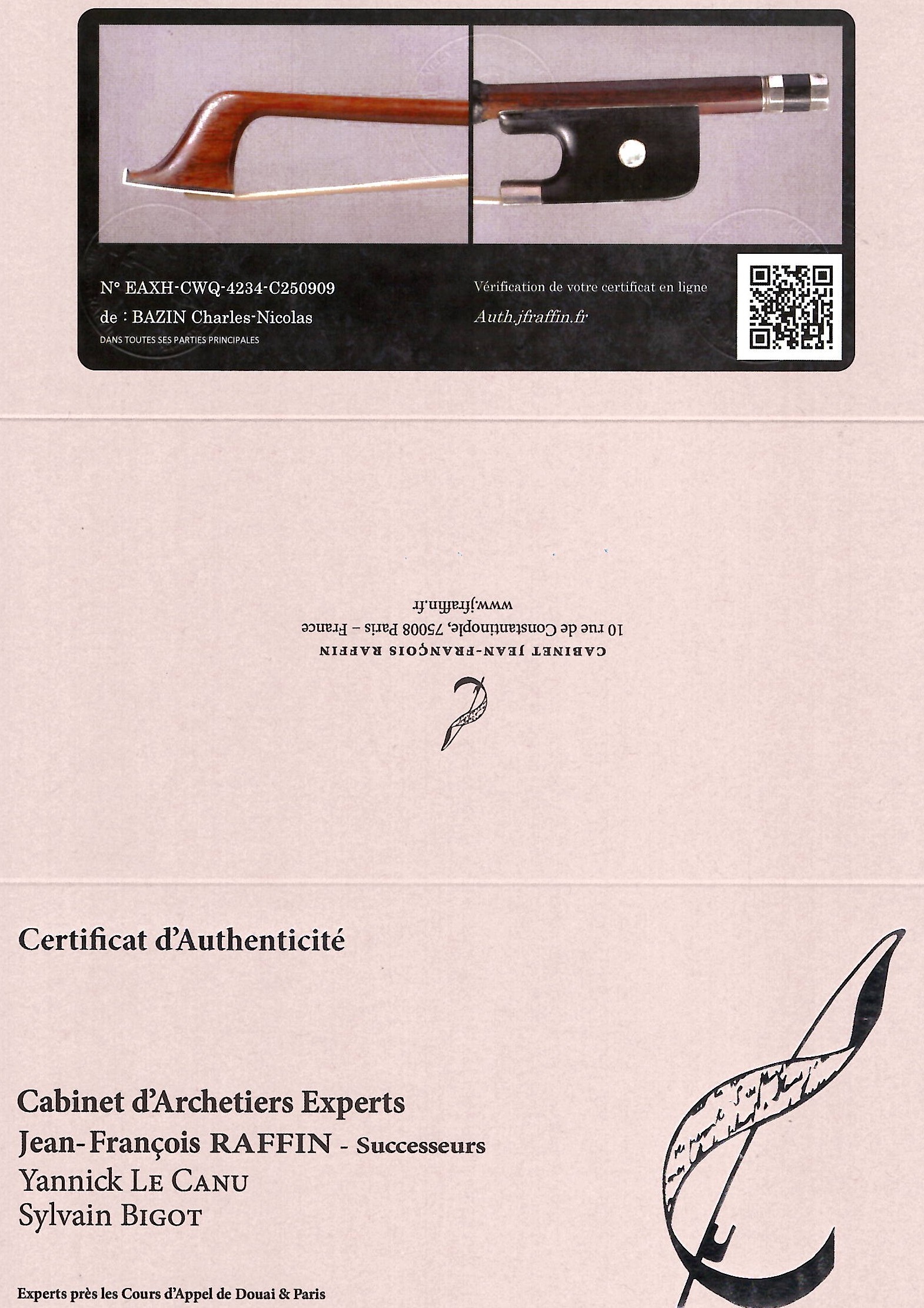 Lot 237, A nickel-mounted violin bow by Charles Nicolas Bazin, Mirecourt, circa 1905