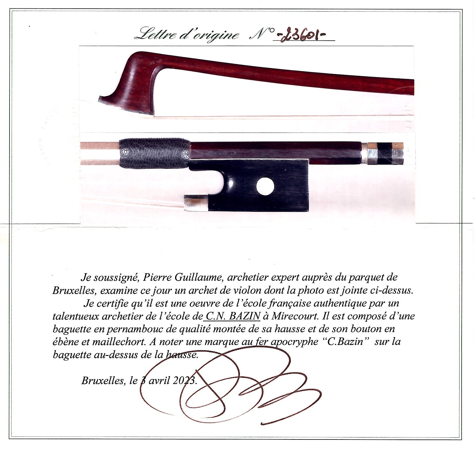 Lot 237, A nickel-mounted violin bow by Charles Nicolas Bazin, Mirecourt, circa 1905