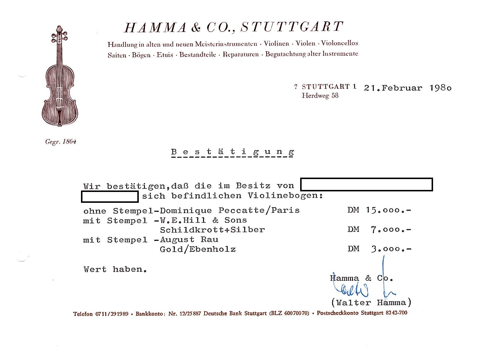 Lot 243, A silver-mounted violin bow by W.E. Hill & Sons, London, 1938
