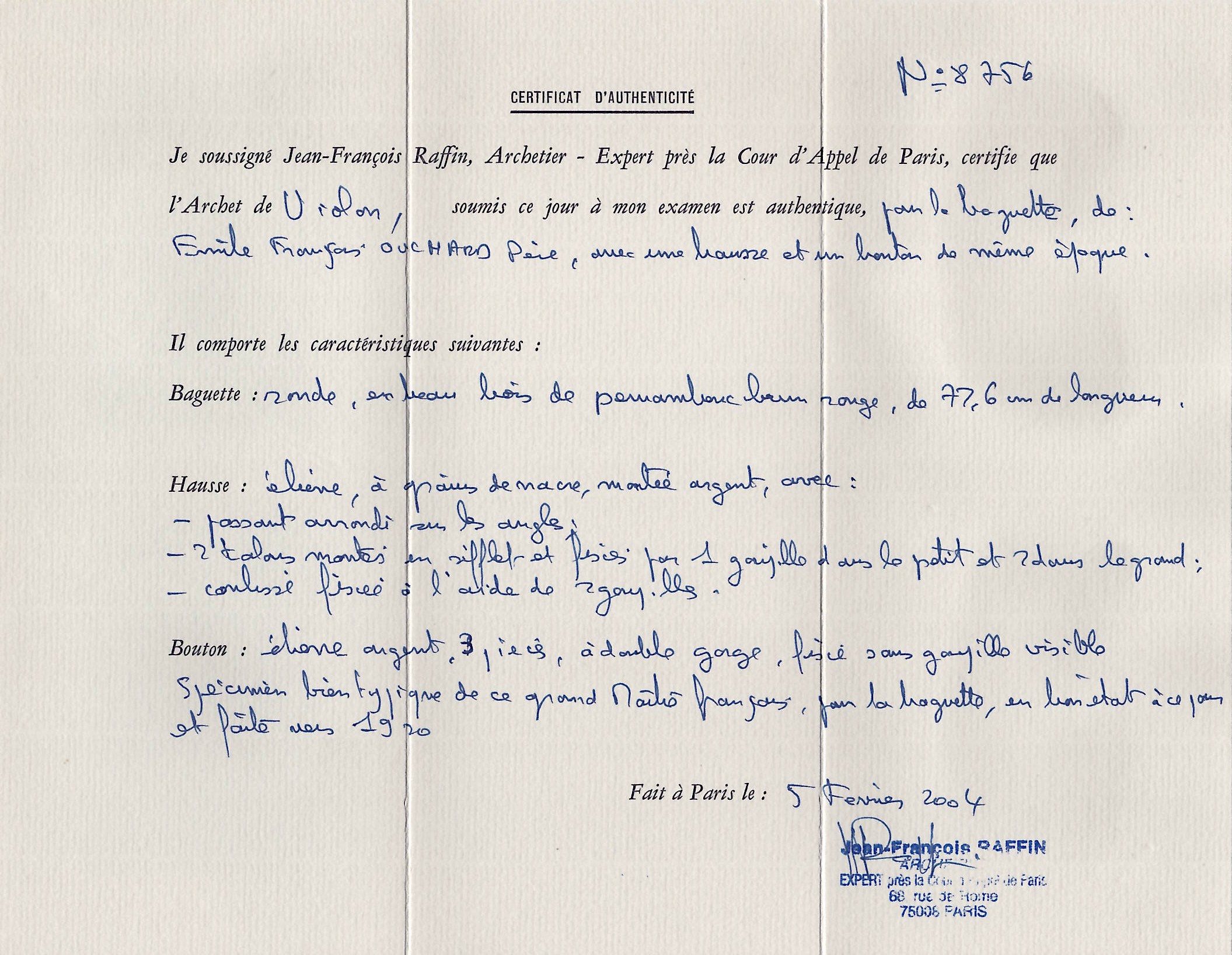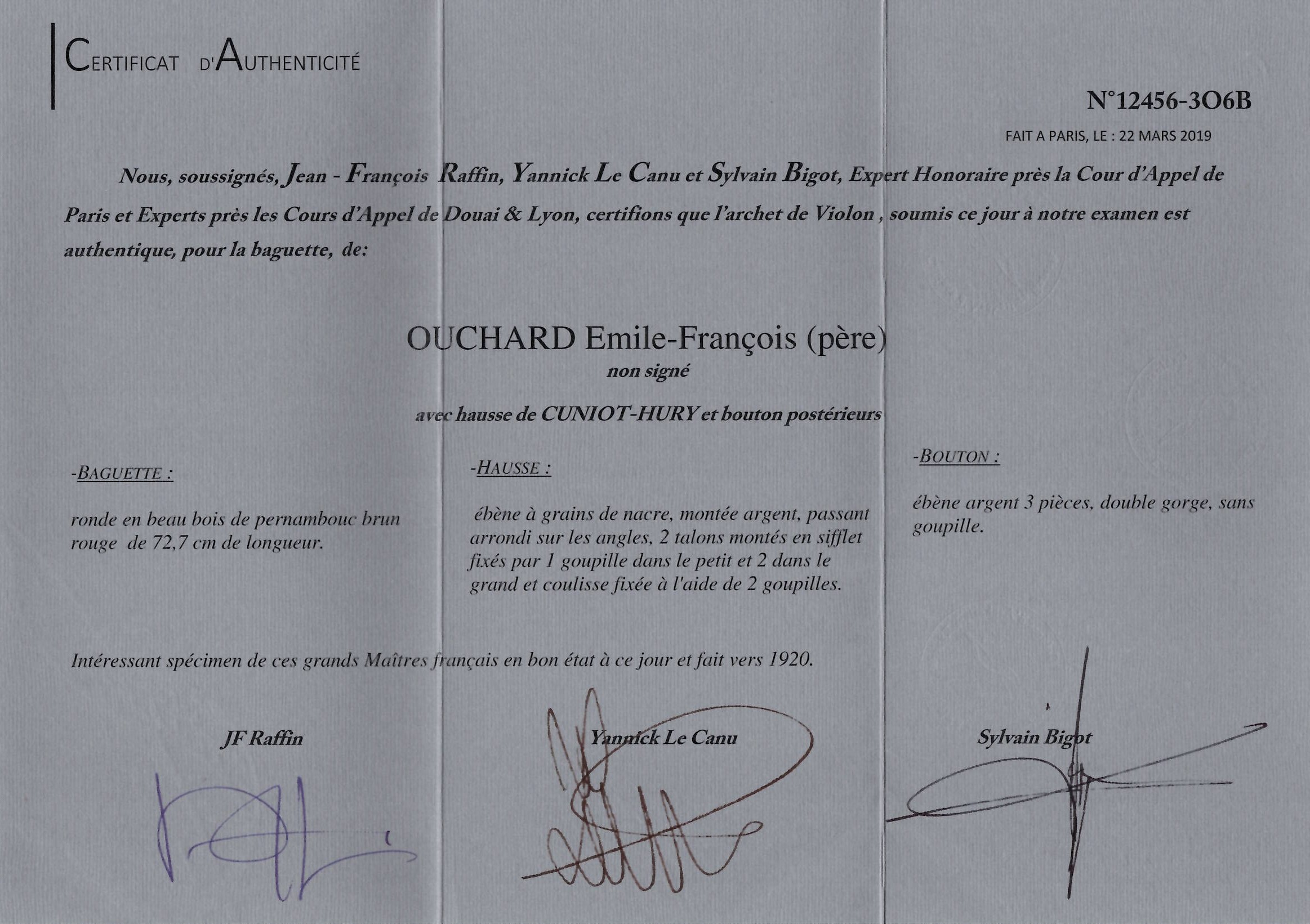 Lot 82, A nickel-mounted violin bow by Émile François Ouchard, Mirecourt, circa 1920