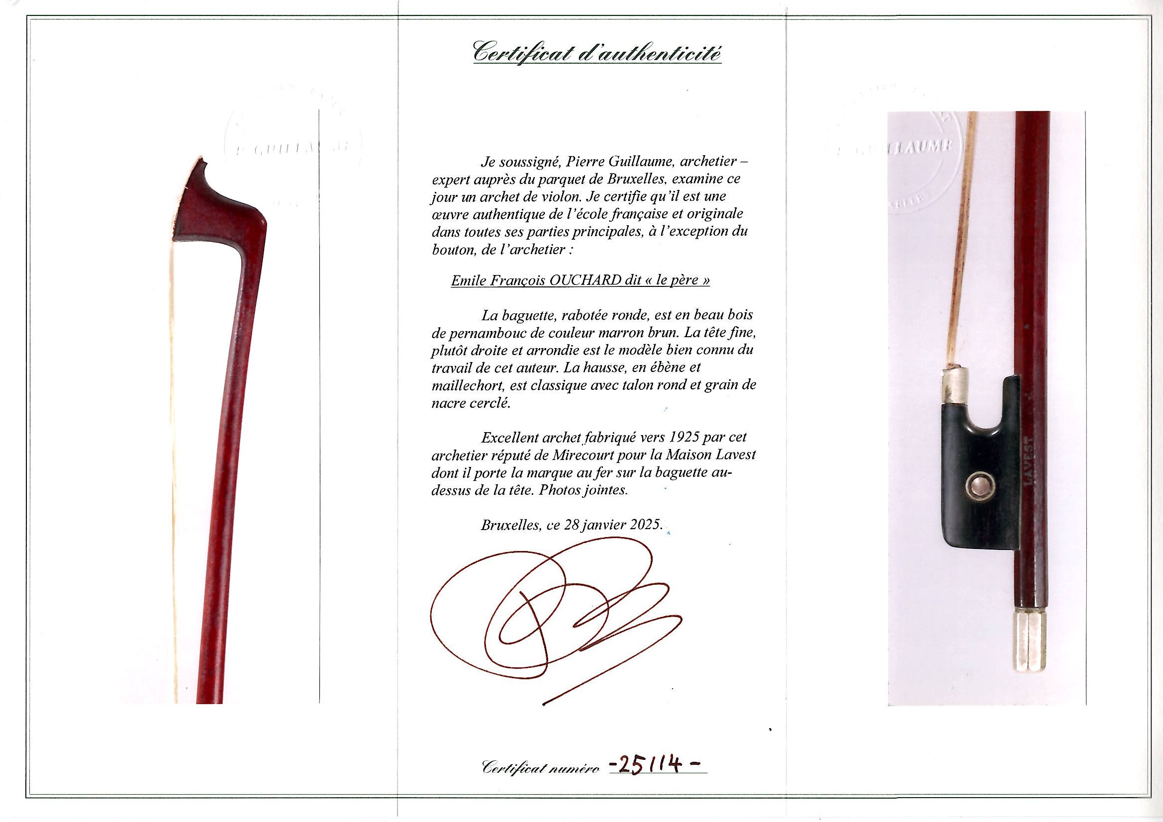 Lot 231, A silver-mounted violin bow by Émile François Ouchard, Mirecourt, circa 1920