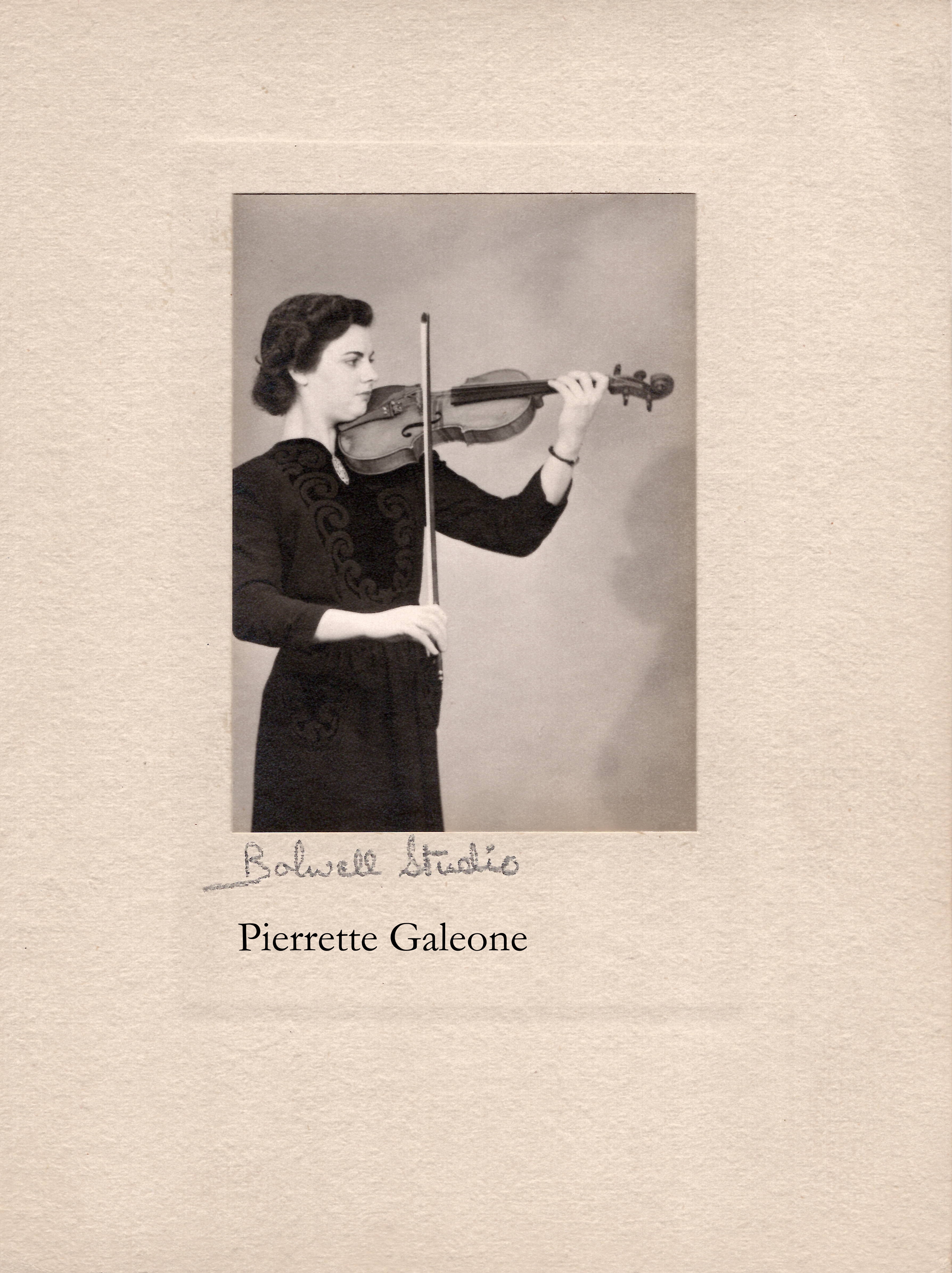 ProvenancePierrette Galeone won a scholarship to the Royal Academy of Music at the age of 16, and continued her studies at the Paris Conservatoire. In 1949, aged 23, she played the first movement of Lalo's Symphonie Espagnole on the TV show Opportunity Knocks. She founded the Galeone Pianoforte Ensemble in 1952 and was invited by Walter Legge to join the Philharmonia Orchestra, where she played under Karajan, Menuhin and Toscanini as one of the few female players in the orchestra.