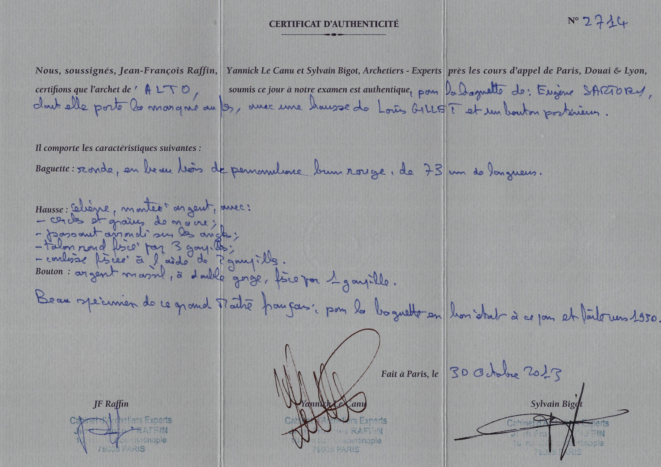 Lot 151, A silver-mounted viola bow by Eugène Sartory, Paris, circa 1930