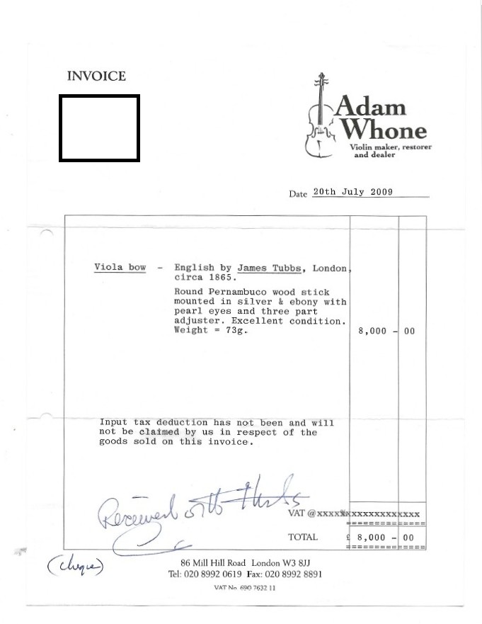 Lot 153, A silver-mounted viola bow by James Tubbs, London, circa 1870