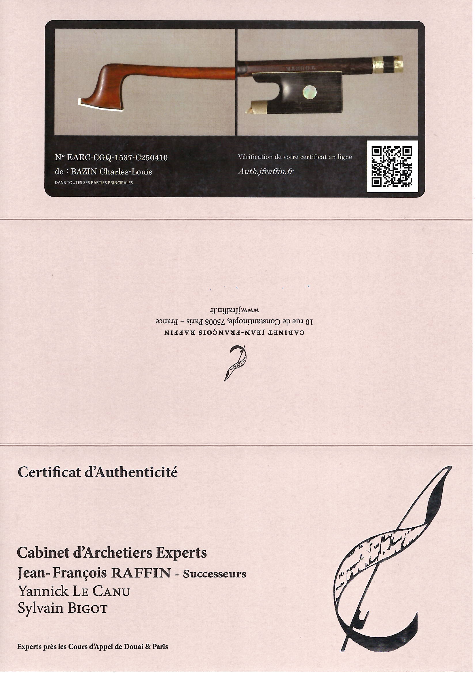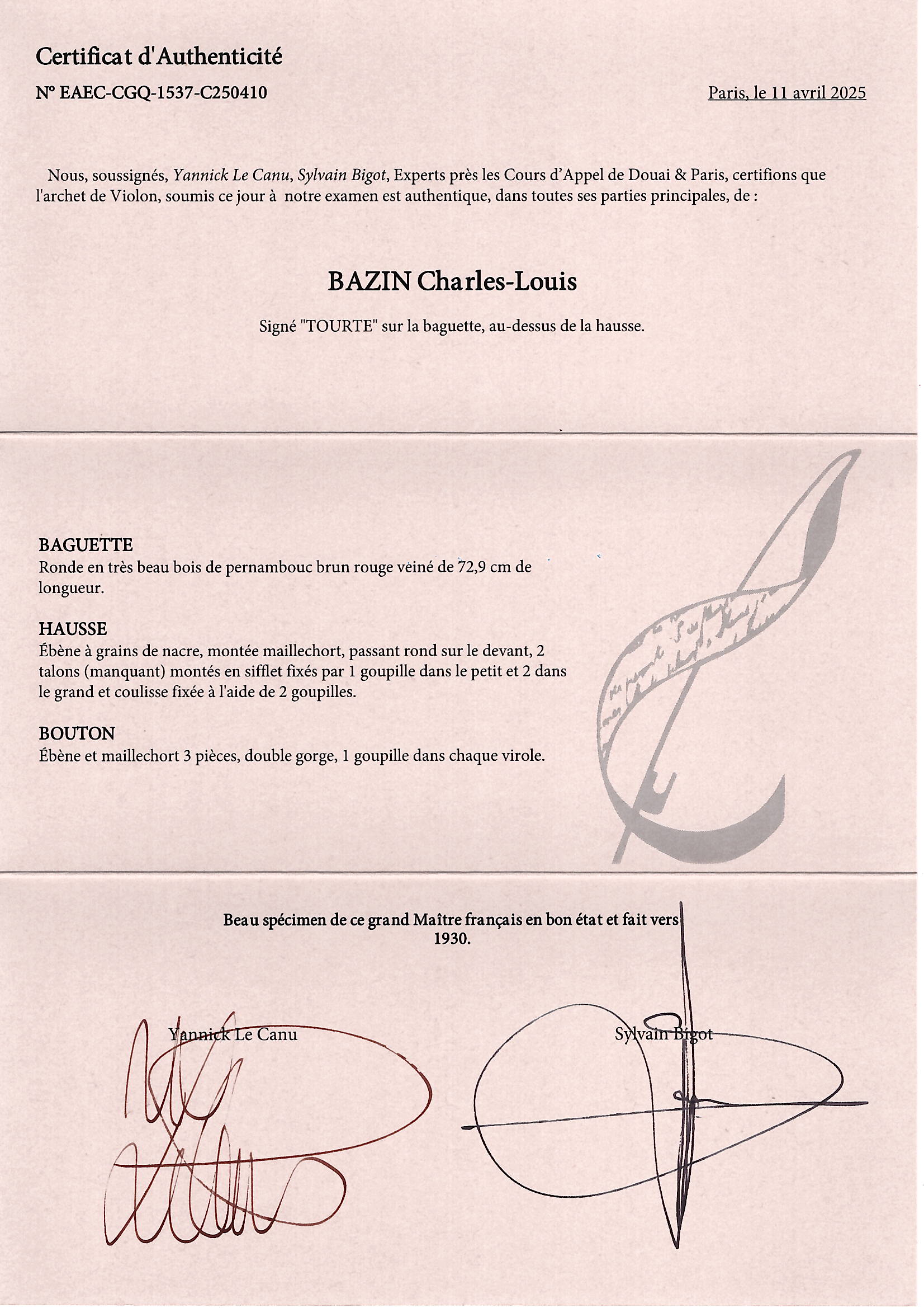 Sold with the certificate of Cabinet d'Archetiers Experts, Paris, dated 11th April 2025