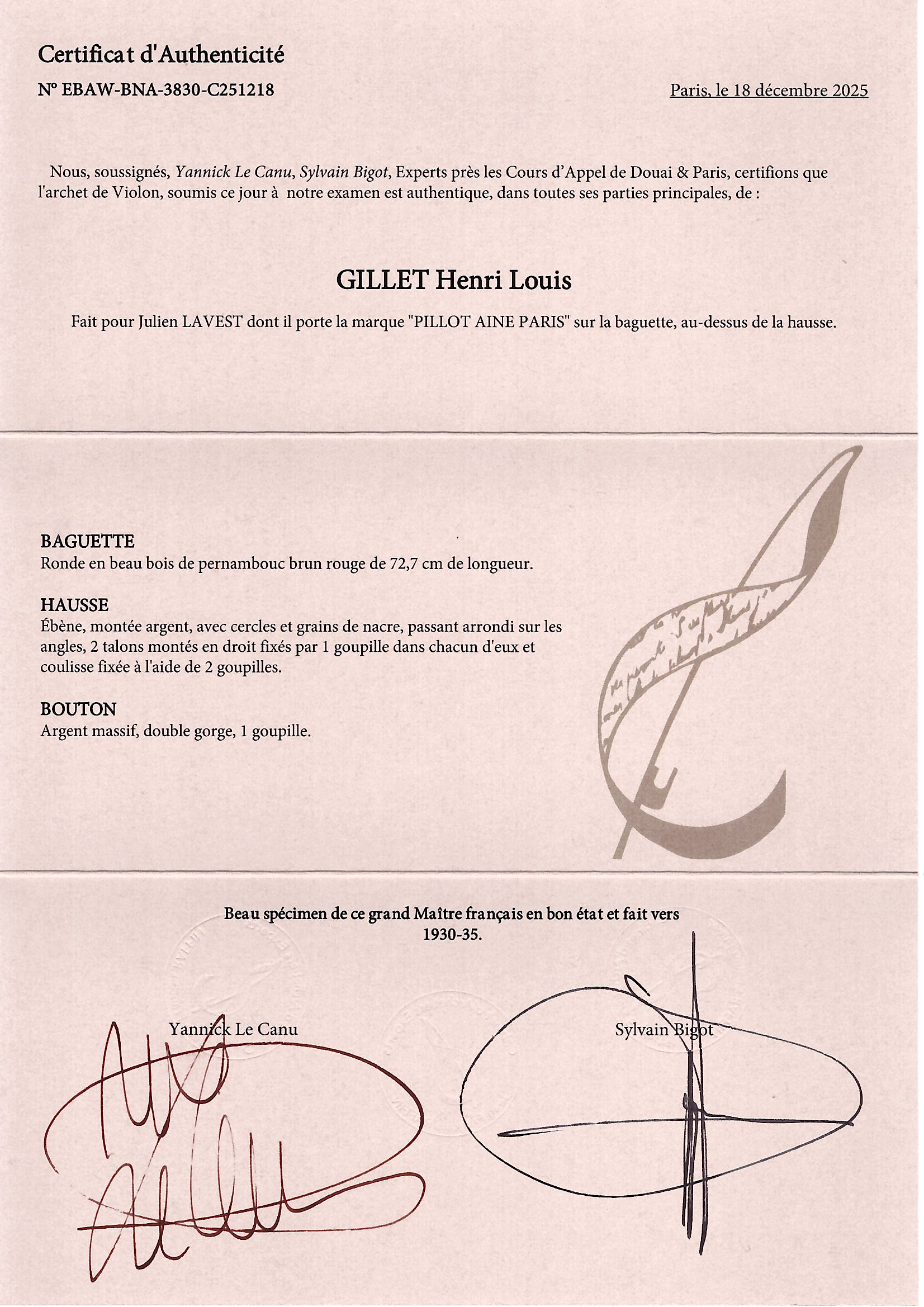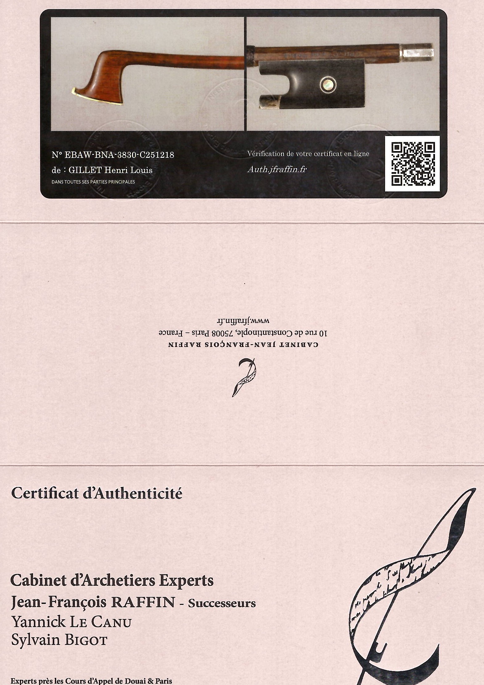 The stick of this bow is made of pernambuco and the faceplate is made of ivory. Both require UK re-export CITES permits - these will be applied for after the auction and a charge of £75 will be added to the invoice if you are registered outside the UK