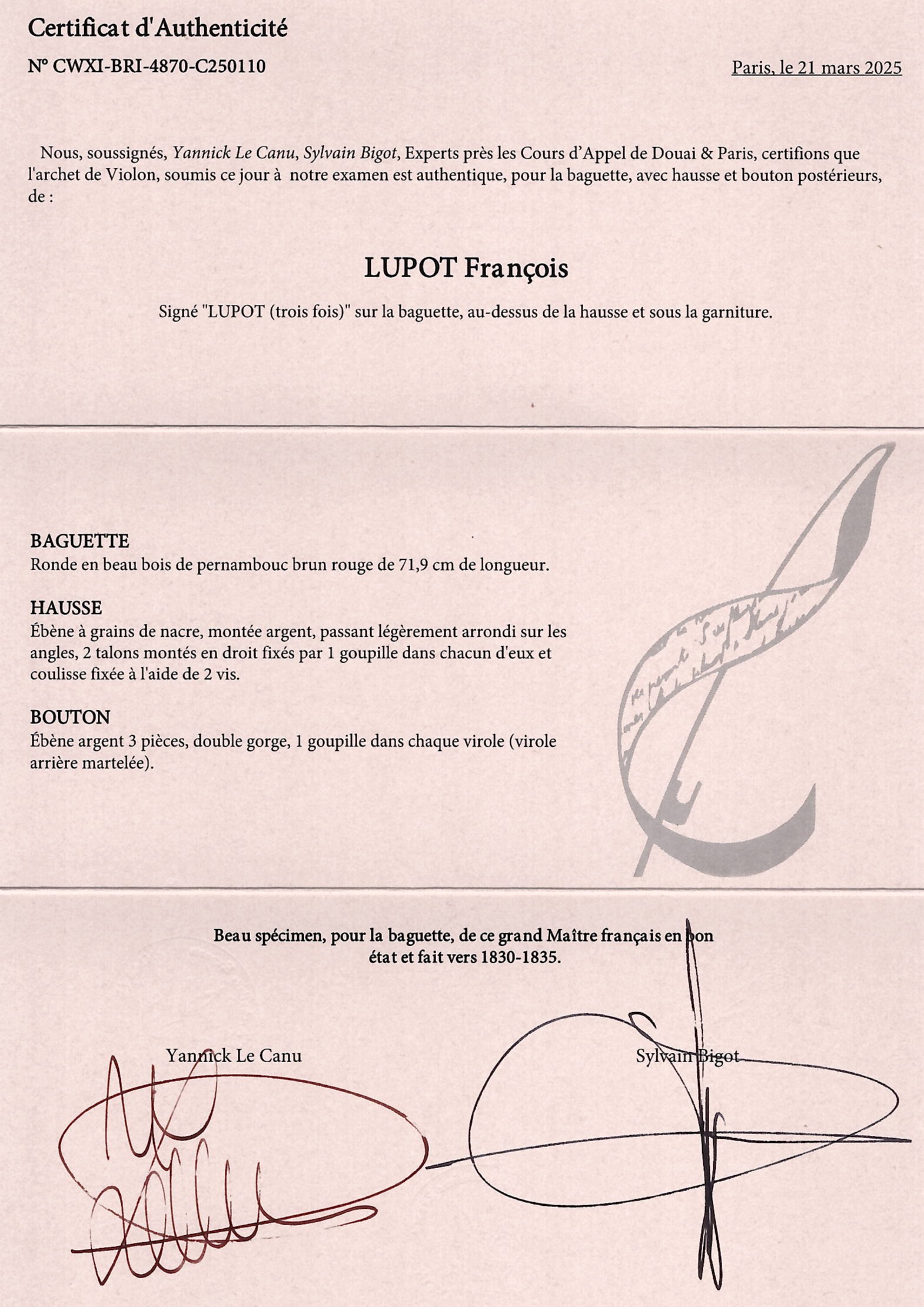 The stick on this bow is made of pernambuco and requires a UK re-export CITES permit - this will be applied for after the auction and a charge of £50 will be added to the invoice if you are registered outside the UK