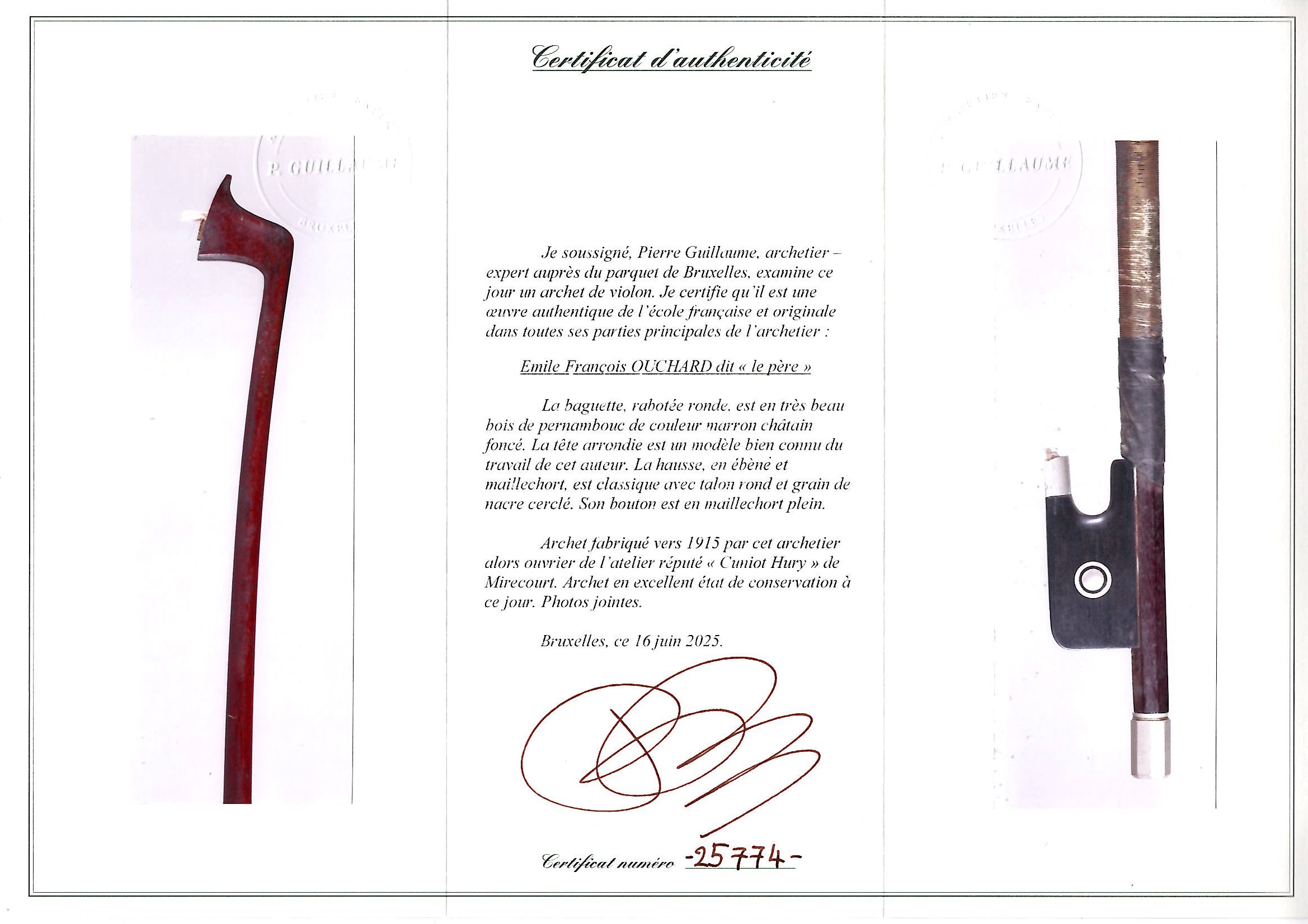 Lot 202, A nickel-mounted violin bow by Èmile François Ouchard, Mirecourt, circa 1915