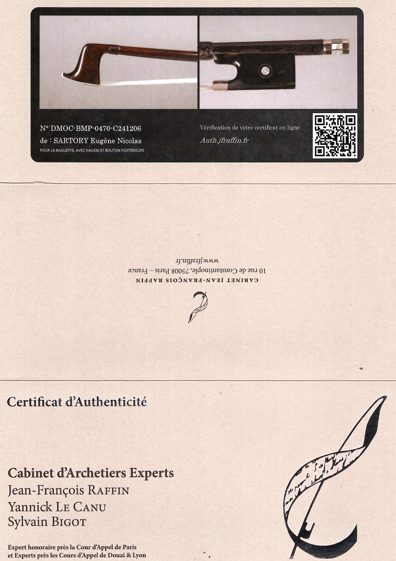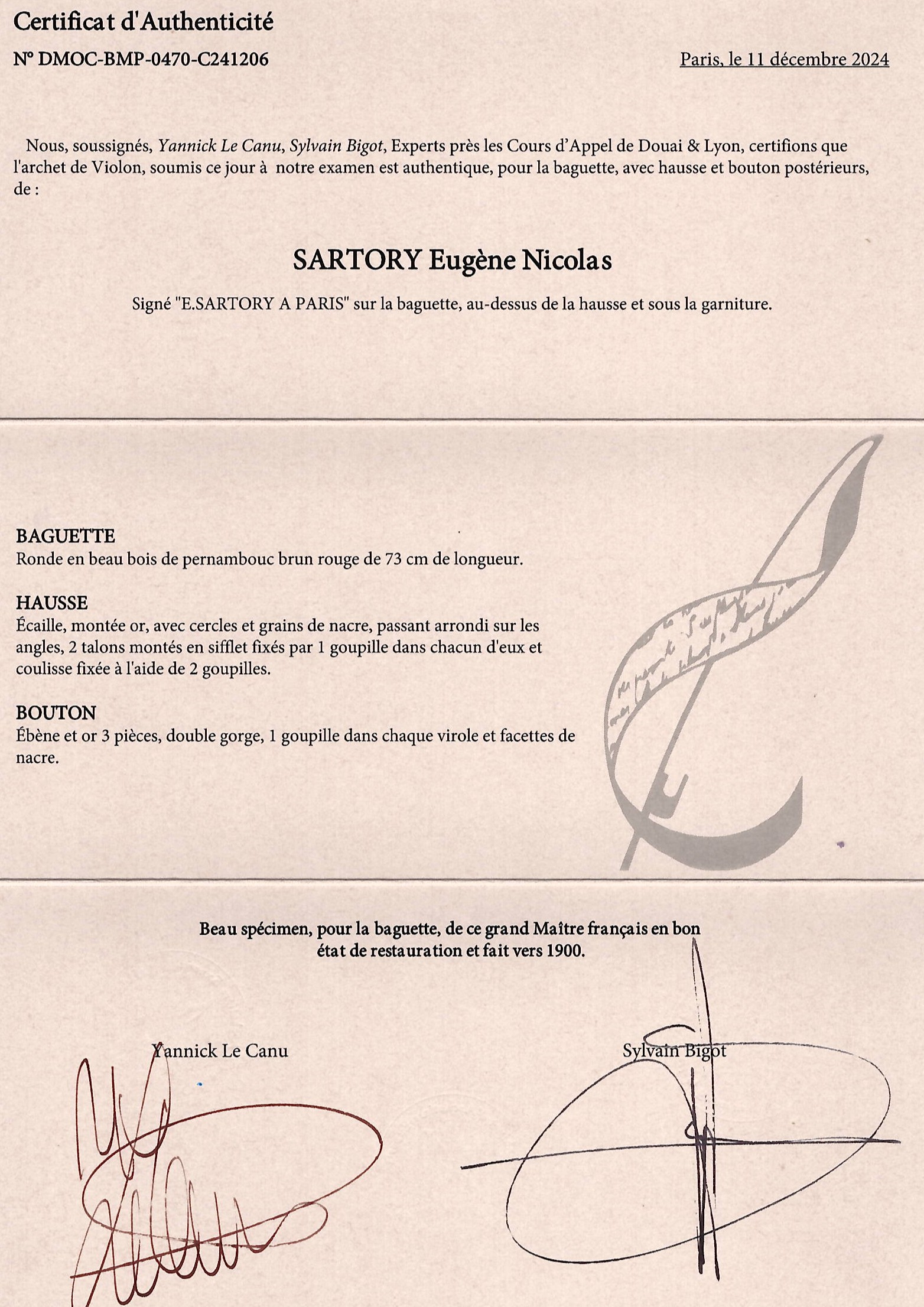 Lot 122, A silver-mounted violin bow by Eugène Sartory, Paris, circa 1930
