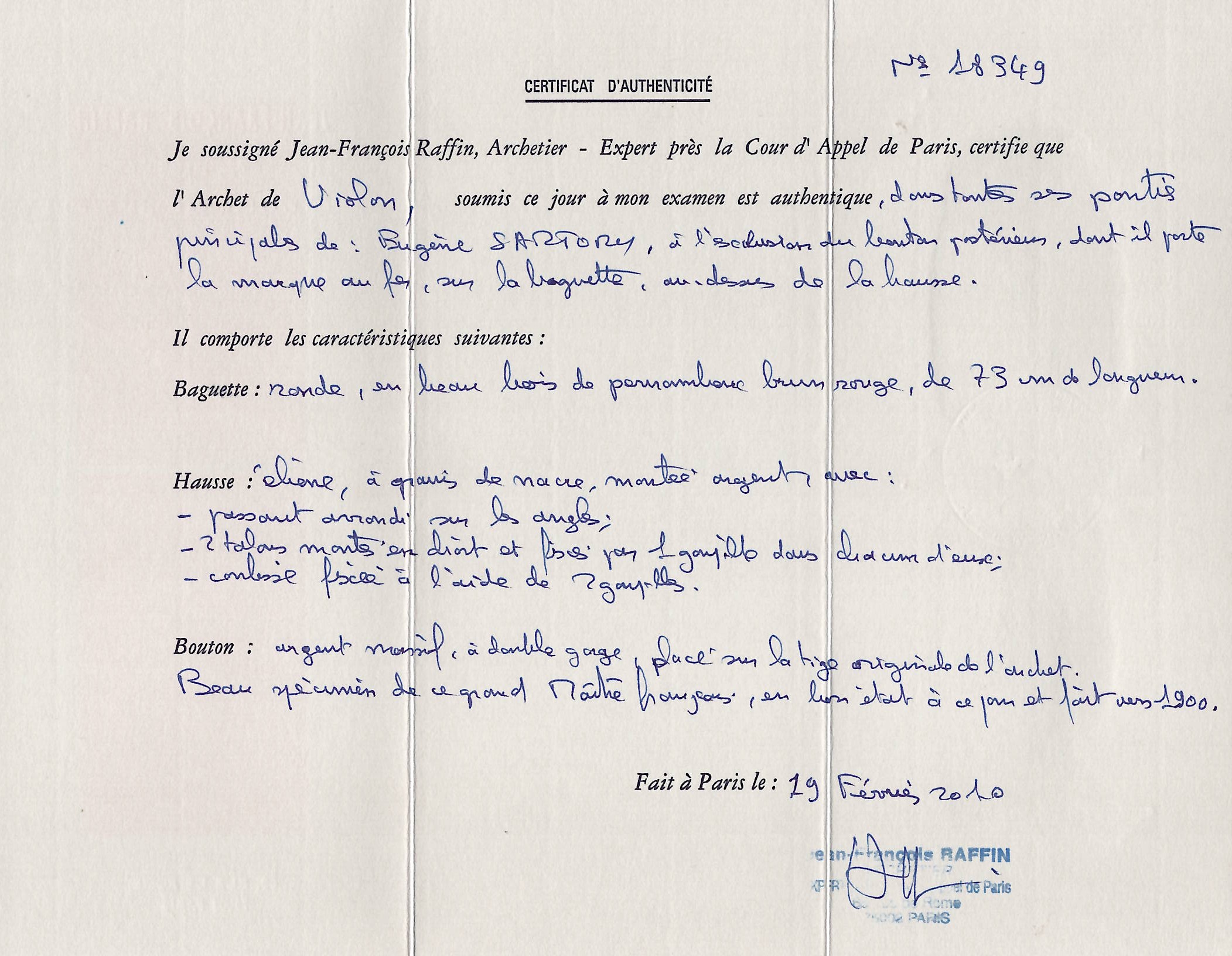 Lot 182, A silver-mounted violin bow by Eugène Sartory, Paris, circa 1900