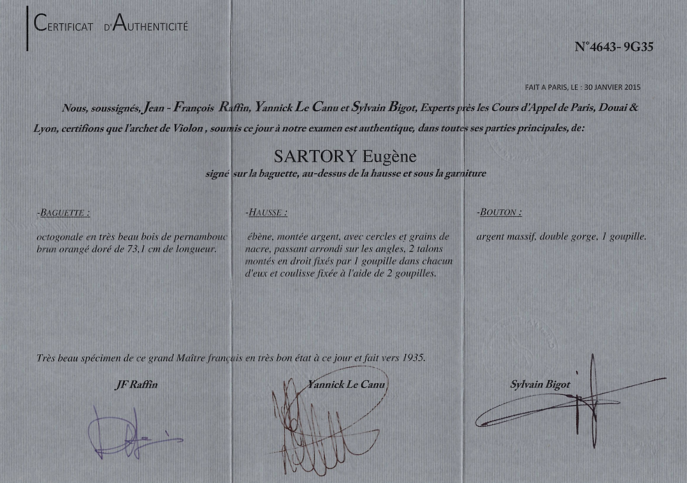 Lot 122, A silver-mounted violin bow by Eugène Sartory, Paris, circa 1930