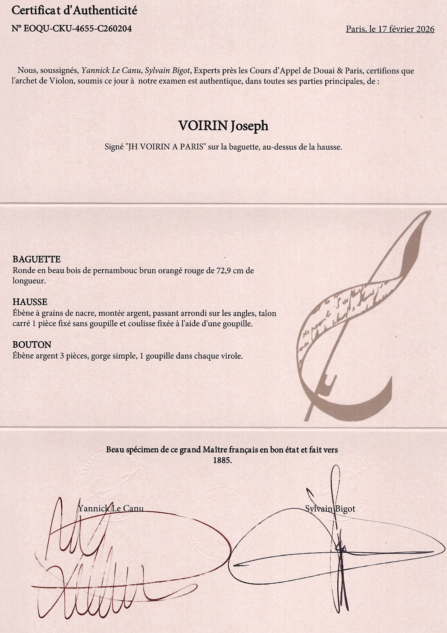 The stick of this bow is made of pernambuco and requires a UK re-export CITES permit - this will be applied for after the auction and a charge of £75 will be added to the invoice if you are registered outside the UK