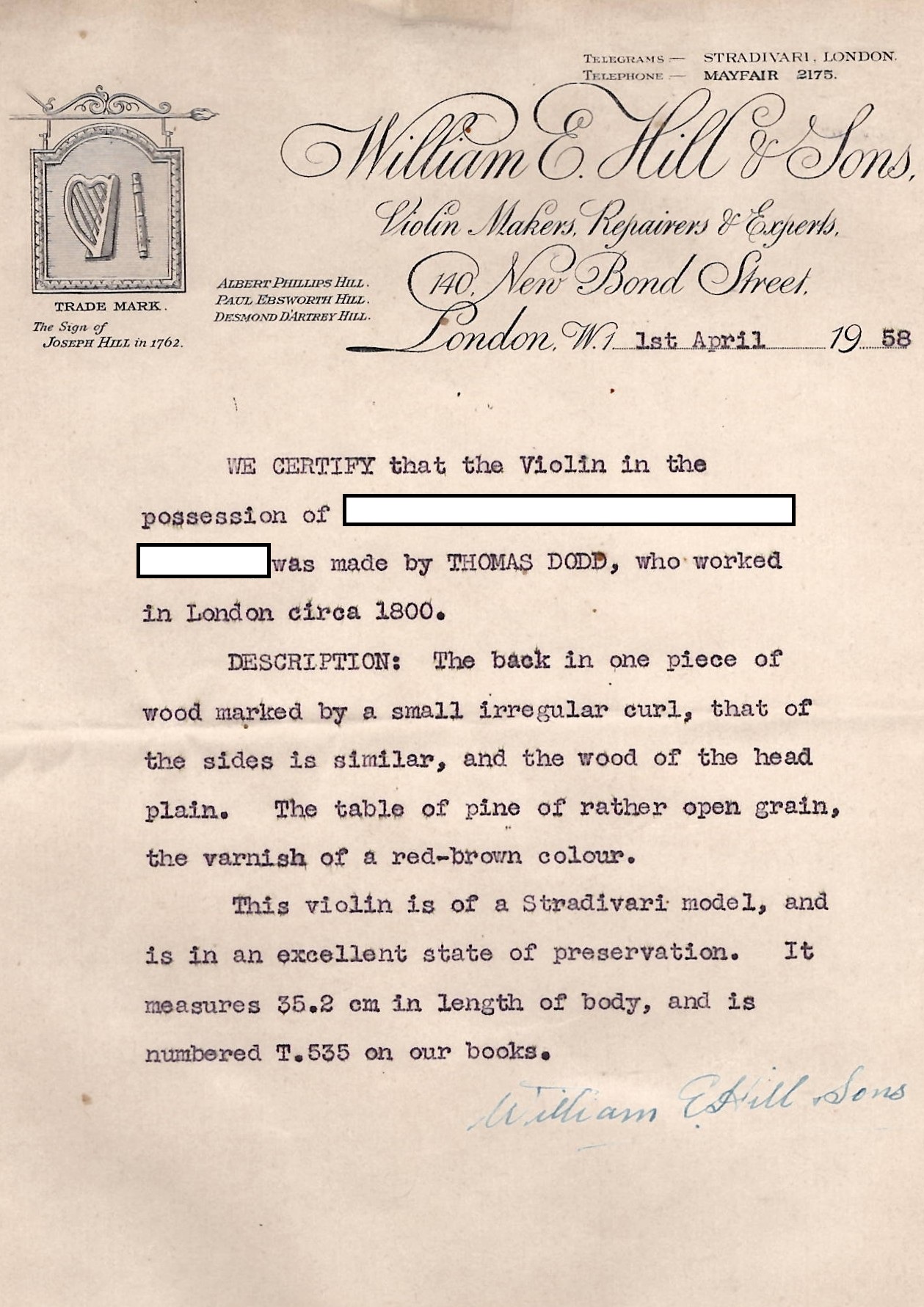 Sold with the certificate of W.E. Hill & Sons, London, dated 1st April 1958