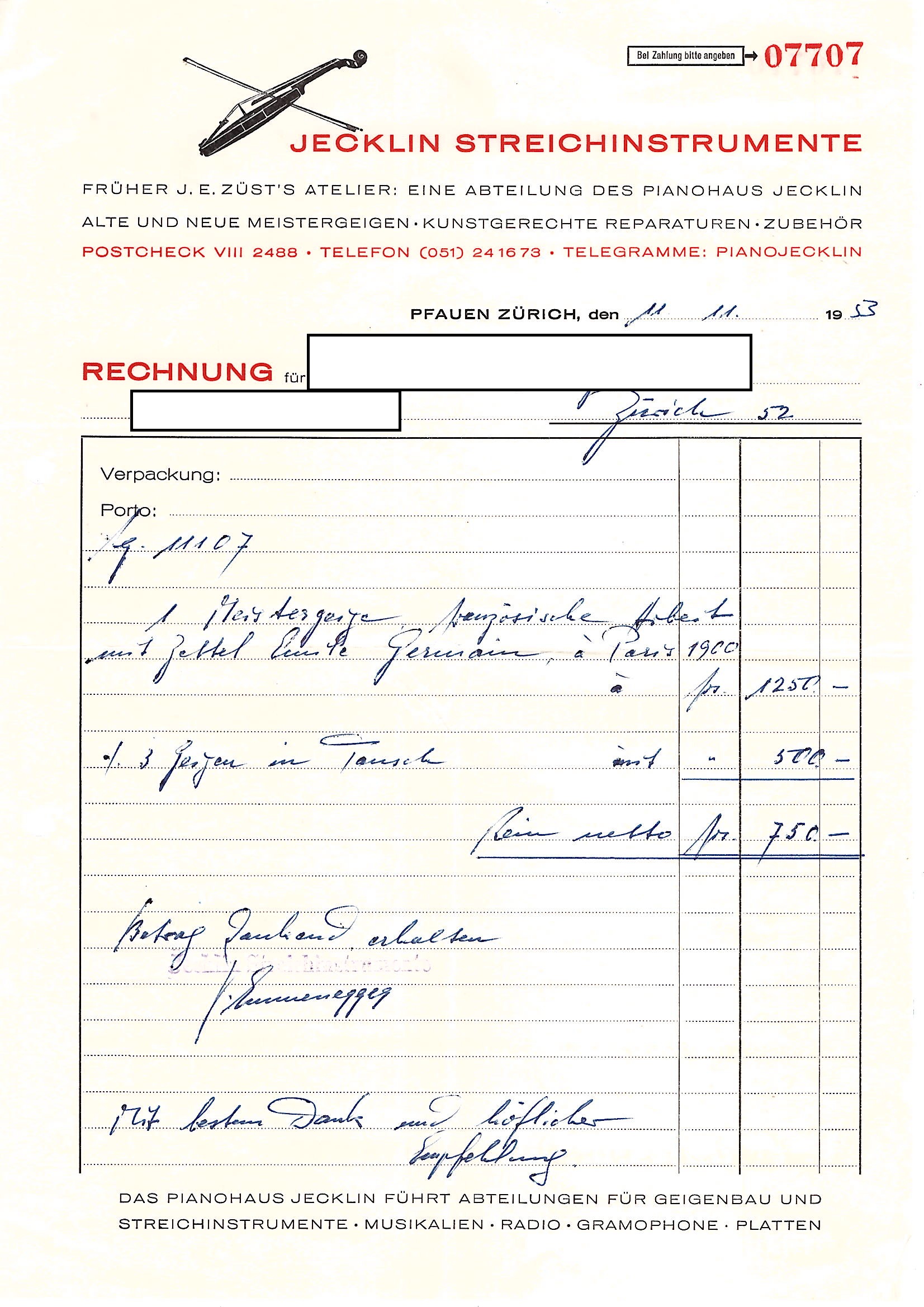 Sold with a receipt from Jecklin Streichinstrumente, Zurich, dated 11th November 1953