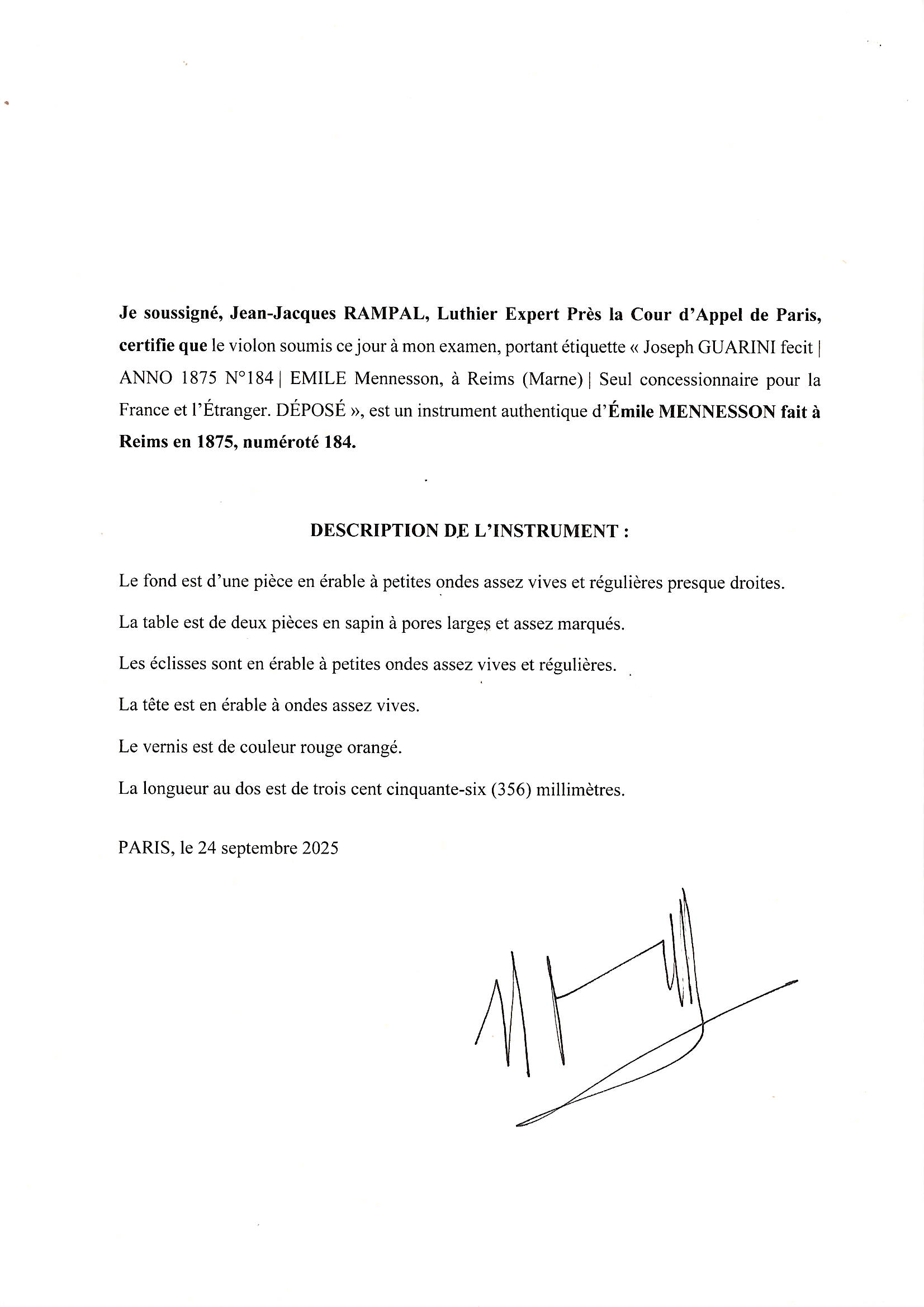 Sold with the certificate of Jean-Jacques Rampal, Paris, dated 24th September 2025
