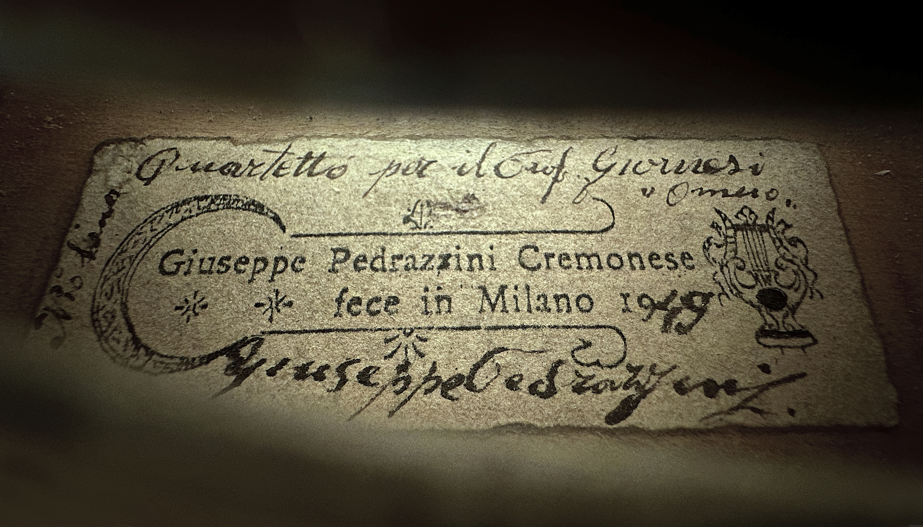 labelled with signature Giuseppe Pedrazzini Cremonese fece in Milano 1949 and inscribed on the label 2° Violino Quartetto per il Prof. Giornasi, "Omero"