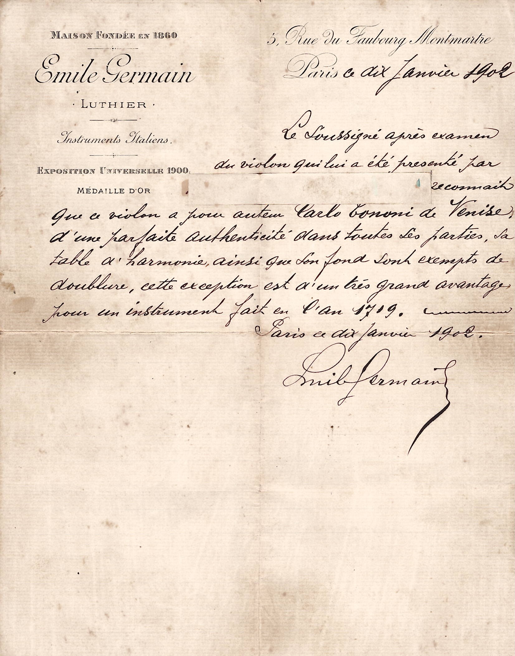Sold with the certificate of Émile Germain, Paris, dated 10