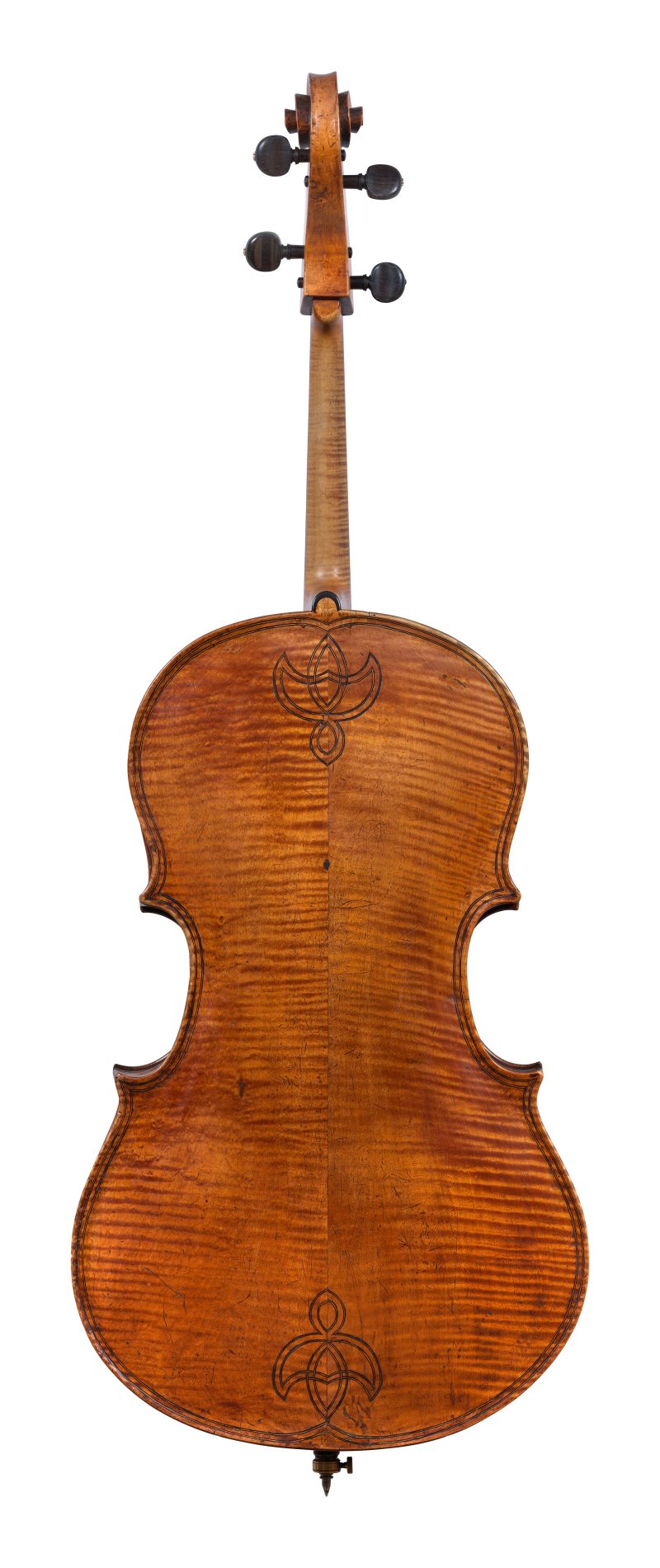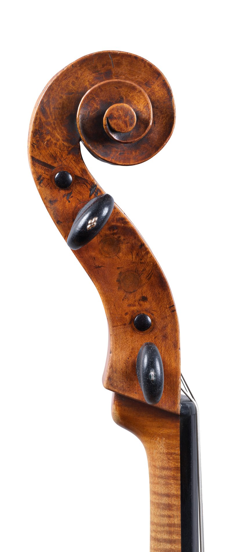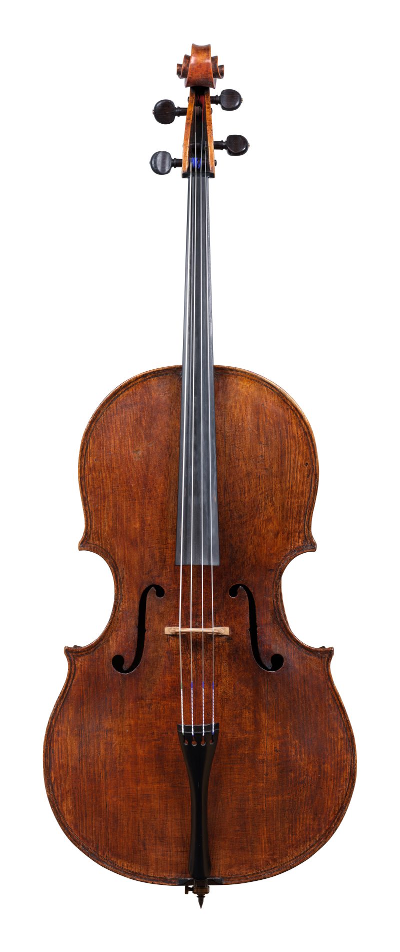 Born in the town of Saló in 1540, Gasparo Bertolotti settled in Brescia in 1563. He very likely started instrument making shortly after and was prolific throughout his life. This cello was possibly conceived as a viol as the pegbox could accommodate at least 5 pegs. The front was made by Francesco Rugeri, very probably as a repair front, as it matches the outline of the back perfectly. This instrument has a rich sound that breaches the gap between modern playing requirements and the old Brescian sound.